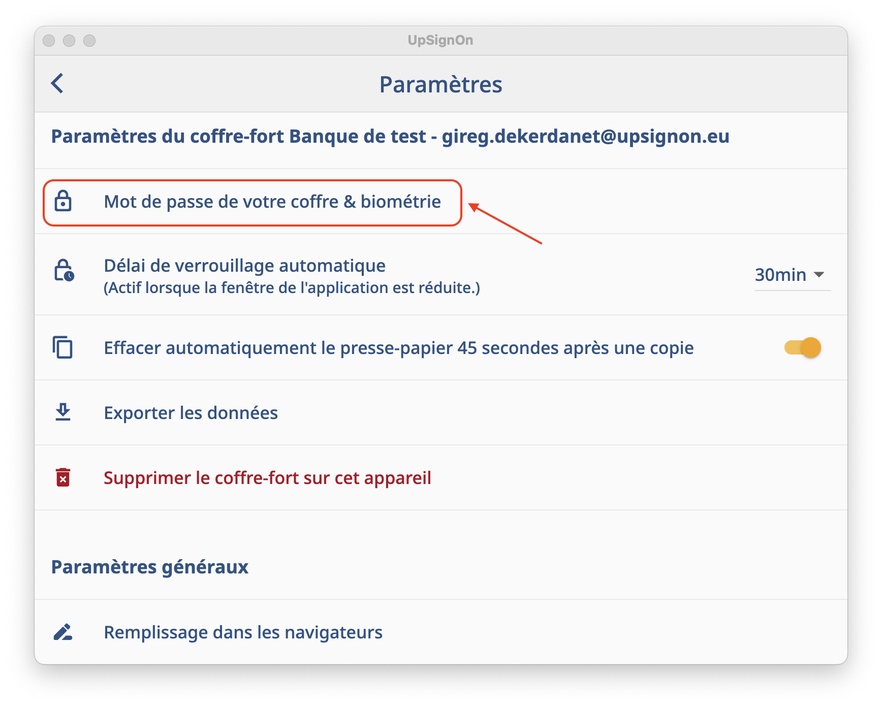 - 2 - Cliquez sur le menu “Mot de passe de votre coffre & biométrie”